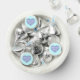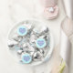 This candy party favor features a sky blue heart overlaid by template text for the names of the bride and groom and the wedding date. The blue heart candy design can be customized for a baby boy baby shower, baptism, birthday, engagement, Valentine's, or anniversary celebration.