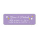 Your home address personalized in a easy way... pale purple color label with two lines of text aligned by center, and bride and groom names written in a stylish script font style with the image of small white and gold hearts of love.