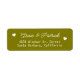 Your home address personalized in an easy way... olive color label with two lines of text aligned by center, and bride and groom names written in a stylish script font style with the image of two small white hearts of love.