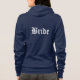 This women's Bella soft zip hoodie for the bride to relax in is shown in navy blue and has white color Bride text on the front and back.