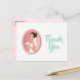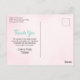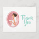 A bridal shower thank you postcard with an illustration of a smiling bride holding a bouquet of flowers in her fancy white wedding dress and wearing a veil. Set inside a pink oval frame with a scalloped border.
