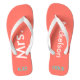 Bright coral background with Mrs. and Last Name written in white text and date of wedding in turquoise blue. Pretty beach destination or honeymoon flip flops for the new bride. Original designs by TamiraZDesigns.