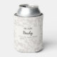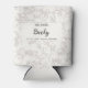 A personalized can cooler with the title, names, date and/or location of your wedding celebration. Here is the almost white version: white background, light gray floral pattern, and the most important information in darker lettering on an almost white background.