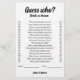 Make your wedding, engagement party, or bridal shower unforgettable with our "Guess Who: Bride or Groom?" game. Featuring a stylish black and white design with elegant calligraphy, this game is the perfect icebreaker, sparking fun and laughter among your guests. Participants will guess interesting facts and stories about the bride and groom, creating an engaging and interactive experience. Easy to set up and play, this game is a fantastic addition to any celebration, bringing everyone together and making your event even more memorable. Ideal for weddings, engagement parties, and bridal showers, "Guess Who: Bride or Groom?" combines entertainment with a personal touch, celebrating the couple's unique journey. Add a sophisticated yet playful element to your special day with this charming game!