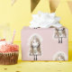 Cute stick figure bride with veil, blond hair, lace dress, and high heels on a pink blush background.