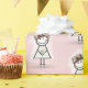 Cute stick girl in sneakers, white bridal veil, lace dress, hair, pearl necklace, and holding a daisy bouquet for a bridal shower on blush pink.