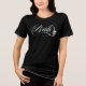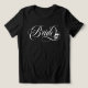 Bride t-shirt for a goth wedding with bride printed across the chest in a swirly calligraphy script with a skull in one of the loops. On the back, Til death to us part with your names and wedding date. Personalized til death do us part t-shirt for the bride, printed on both front and back and customized with the bride and groom's names and wedding date. Get the matching tee for the groom too!
