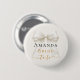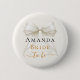 Celebrate your special milestone with this chic bachelorette party button. The design features a luxurious ivory bow adorned with delicate pearl strands and sophisticated gold-toned script. It serves as a stylish accessory for the bride-to-be to wear during her bridal shower or night out with bridesmaids. Ivory background color.