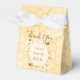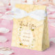 A favor box for a summer Bridal Shower. Yellow, white background with a honeycomb pattern. With a faux gold geometric frame. Decorated with light yellow, cream colored tropical florals flowers, hibiscus and happy bumble bees. With the text: Thank You and Bride to Bee written with a modern hand lettered style script. Template for the bride to be's name and the date of the shower. Brown letters.