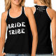 A classic black t.shirt with bride tribe in white on the front. The back features more customisable text. To change the name or delete, click on the personalize button.