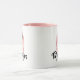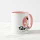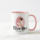 A custom coffee mug personalized with your name underneath the text: Future Mrs. Designed with an illustration of a smiling bride holding a bouquet of flowers in her fancy white wedding dress and wearing a veil. Set inside a pink oval frame with a scalloped border.