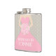 Elegant graphic bridesmaid in pretty pink dress in holding a posy of pink stylized roses wedding hip flask. Reads Bridesmaid Connie. Personalize with your own name and title. A great gift idea for bridal showers, hen nights or wedding rehearsals.