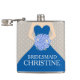 Elegant graphic bridesmaid in pretty blue dress in holding a posy of pink stylized roses wedding hip flask. Reads Bridesmaid Christine. Personalize with your own name and title. A great gift idea for bridal showers, hen nights or wedding rehearsals.