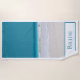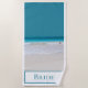 Bride's beach themed wedding beach towel with a photograph of a white sandy beach and turquoise water. Text, across the bottom of the towel reads Bride, and can be personalized to read what you want. Perfect for the beach wedding and honeymoon. Available for the groom also.