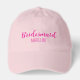 This fun bridesmaid baseball cap is featured in light pink with hot pink typography. The word, "Bridesmaid" appears in a beautiful typestyle with the name of your bridesmaid below. These make great bridesmaid gifts. Copyright Kathy Henis