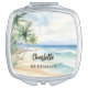 A tropical beach, waves and palm trees, watercolored. Personalize and add your bridesmaid's name. Black handwritten style script.