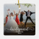 Add wedding party or bridesmaid photos to this 2-photo Christmas ornament. Easily add your custom photos on front and back, double 2 sided ornament... Stylish Loose and casual script typography, your names and year or othertext. Modern, simple casual elegant script writing. Celebrate your bridesmaids, maid of honor and wedding party with this customizable beautiful keepsake holiday gift ornament. Upload your photo2 to create a full-bleed holiday Christmas ornament, a wonderful gift idea.