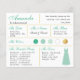 A bridesmaid info card for a mint and gold wedding, including information about the wedding date and location, the wedding colors, the bridal party, the bridesmaid dress and a bridesmaid proposal message. The name of the bridesmaid and the titles are written in a darker mint green elegant script. In the lower right corner, there is a mint dress. In the center, there are the wedding colors in circles. The colors, including the color of the wedding dress, can be changed, with the exception of the gold circle, that is faux gold foil. The default colors are three shades of mint, white and gold. The back is light mint like the bridesmaid dress color.