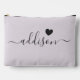 This elegant accessory pouch features a stylish lavender gray background adorned with a modern script font displaying a personalized name and a charming heart design. The soft, feminine color and sophisticated typography make it a perfect accessory for bridesmaids or anyone who appreciates chic and trendy designs. Its versatile use and personalized touch add a special element to this beautiful piece.