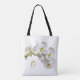 Bridesmaids and bridal party gift tote bags. Realistic, white orchids design on both sides of a quality white tote bag. Personalize with her name and title (bridesmaid, maid of honor, junior bridesmaid, or flower girl) in golden yellow script and modern printed text. On the other side, include her monogram initial. Be sure to customize both sides.