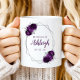 This lovely wedding coffee mug features a silver geometric frame decorated with a pair of vintage purple and silver floral bouquets. Personalize it with the bridesmaid's name in elegant purple calligraphy, along with the wedding date in purple sans serif type. The word "bridesmaid" can be customized for other members of the wedding party.