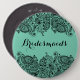 Black paisley floral lace over mint green paisley damasks background, customizable Bridesmaids button.