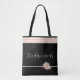 This Bridesmaids tote bag is shown in black with accenting neutral tan stripes at top and a solo pale pink peony on neutral stripe three-fourths down the bag. Bridesmaids written in a fun playful script. Design on front and backside. Customize this item and or buy as shown. If personalizing, remember to personalize both sides!