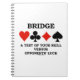 Wry bridge humor is alive and well on any of these gifts featuring the four card suits along with the following bridge saying: "Bridge A Test Of Your Skill Versus Opponents' Luck". No need to be an experienced bridge player to enjoy tongue-in-cheek bridge attitude today with these memorable bridge saying gifts!