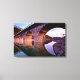 Add beauty to your space with this wall hanging of a crisp photograph of an arched bridge. The coloring is subtle. The stone arches of the bridge are warmed by a setting or rising sun while the still water below reflects the arches into circles.