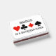 Showcase your wry duplicate bridge humor side with this matchbox featuring the four card suits, along with the saying "Bridge Is A Bayesian Game". No need to be a mathematician or statistician to enjoy calculating probabilities at the bridge table. Make others do a double-take and think in Bayesian terms with this matchbox!