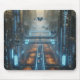 A sleek cyberpunk bridge connecting two mega-districts, lined with neon rails and patrolled by hovering drones.