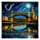 A.I .created print of a vibrant surreal night scene depicts a brightly lit bridge with colorful buildings reflected on a river, beneath a moonlit, starry sky.