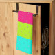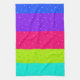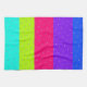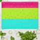 A tea towel with a mix of bright blue, mauve, pink, green and teal stripe pattern, with polka-dots, all colours can be personalized to any colour to coordinate with your kitchen decor, and text can be added to customize for yourself or a gift. White stripes are removable if you prefer.