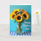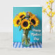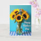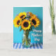 This greeting card features a still-life bouquet of golden daisy-like flowers with deep brown centers, arranged close together like friends leaning in for a shared moment ❤️. Soft lavender round blossoms are tucked between the yellow petals, adding a gentle contrast that feels like a quiet, supportive presence. The flowers sit in a clear glass vase where green stems show through the water, giving the scene a fresh, just-picked look. Behind everything is a wide turquoise background that leaves plenty of open space and makes the warm yellows stand out. A blue-and-white checkered cloth rests under the vase, adding a homey, kitchen-table touch 🌼. On the right side, the words “Happy Mother’s Day” appear in flowing white lettering, placed mid-height against the turquoise area. Light falls evenly across the arrangement, with the glass catching small highlights along its rim and sides. The turquoise background stretches upward while the checkered cloth forms a neat band along the bottom edge.