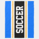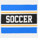 This sporty, athletic design features bold SOCCER text inside a highlighted wide black stripe with double white and yellow orange racing stripes against bright blue outer stripes. The text can be personalized.