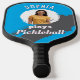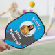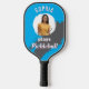 A cool pickleball paddle, which can be personalized with a photo and name on a bright blue background