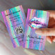 Holographic lips with a flashy light flare against a bright bold and colorful background. Easily personalize with your business information including a handy QR Code and an area to display your social media info. This design works best on the semi gloss paper option.