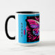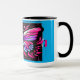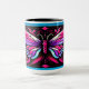 "Bright Butterfly" Customizable Coffee/Tea Mug. Add a pop of color and whimsy to your living space with our blue and pink butterfly pillow featuring a vibrant tattoo-style butterfly design in hot pink, lavender, and black on a turquoise background, making it a versatile and eye-catching addition to your home decor.