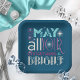 A decorative and positive message for the Christmas season, this typography paper plate design features the text 'May all Your Christmases be Bright" in turquoise, rose and ivory white on your choice of background color. Search ID264 to see other products with this design.