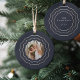 Personalize this elegant ceramic ornament with a photo on the front and a caption on the back, surrounded by a triple geometric border in faux gold foil on a rich navy blue background. This chic design is perfect for commemorating a special year or a special "first."