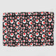 This golf towel is is black with an abstract bright circular pattern of red circles in bigger white circles.