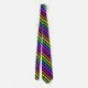 This necktie features brightly colored even stripes with black, yellow, orange, green, blue, hot pink and purple.