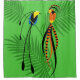Colorful vector art of a pair of fictional exotic birds of paradise with long tail feathers and bright plumage on a bright green background.