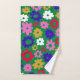 This cute and colorful bath towel set features a fun Scandinavian flower pattern in bright green, blue, pink, and yellow.