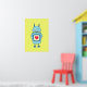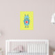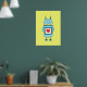 Cute poster with a cartoon illustration of a blue clumsy cartoon robot holding a plate with a heart on bright greenish-yellow background. This robot poster is suitable for kids who love robots. It will make a great gift for geeks, too.