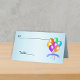 This folded standing place card for your parties, events, and weddings is light blue with a bunch of bright festive balloons in various colors with hanging matching streamers and a blue banner that says Happy Birthday. Customize the name and table number area and text on the back with the templates.