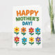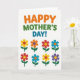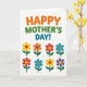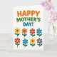 This card features a bright greeting on a white background, with rounded letters across the top that feel like they’re smiling at you ❤️. The text is set in alternating warm orange, leafy green, and calm blue, arranged in a neat line along the upper portion. Beneath it, an even grid of eight simple flowers fills the center area, like a small bouquet lined up for a friendly celebration 🌼. Each flower has rounded petals in different colors—sunny yellow, orange, red, and blue—paired with contrasting circular centers that add a sweet, companionable charm. Slender green stems extend downward from each bloom, and two small leaves sit to either side, giving the layout a tidy, garden-like order. The repeated shapes create a steady rhythm, while the changing colors suggest different little “personalities,” as if each flower is offering a gentle nod of affection. The top greeting stays clearly separated from the floral grid, making the words easy to spot before your eyes drift down to the blooms. The eight flowers are arranged in two rows of four, each with a green stem and paired leaves beneath brightly colored petals.