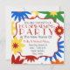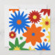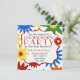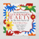 A housewarming party invitation featuring a background of retro inspired flowers in various bright shades of orange, red, green, yellow, and blue on front and back. Personalize the text inside white bracket frame outlined in red.