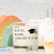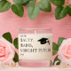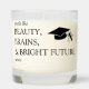 Graduation Scented Candle with saying SMELLS LIKE BEAUTY, BRAINS AND BRIGHT FUTURE AHEAD. Personalize this unique grad gift on the back of the candle with your graduate's name, school, degree or other message. A graduation cap with a ribbon bow decorates the front quote and a small heart is accented on the back of the candle. These unique keepsakes are wonderful graduation gifts for her, for women graduating high school, graduating college, graduating university or graduating higher degree of learning.