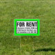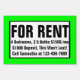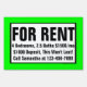 Leasing or renting a house, rental property or commercial office building can be made easier and faster with this bright colored "for rent" sign. This easy to customize outdoor yard/wall/window sign can be customized online and ordered with no minimum quantity. Type in your title text and details or phone number for a professional looking presentation of your information. Neon fluorescent green stands out and has a vibrant color.